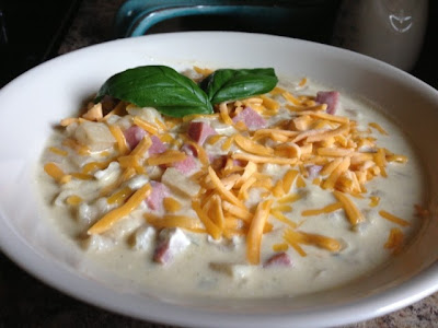 In the crockpot whisk together pepper, 2 cans of chicken broth and one can of broccoli cheese soup (you can use cream of chicken if you prefer). Then add one bag of Potatos O'Brien and half of a chopped onion. Cook on low for 5 hours. Cube softened cream cheese and add in. Also add 1 lb cubed ham. Cook 30-45 min until cream cheese has melted and ham is warmed. Garnish with shredded cheese, green onions or whatever you have on hand. Great with homemade dinner rolls. Enjoy!